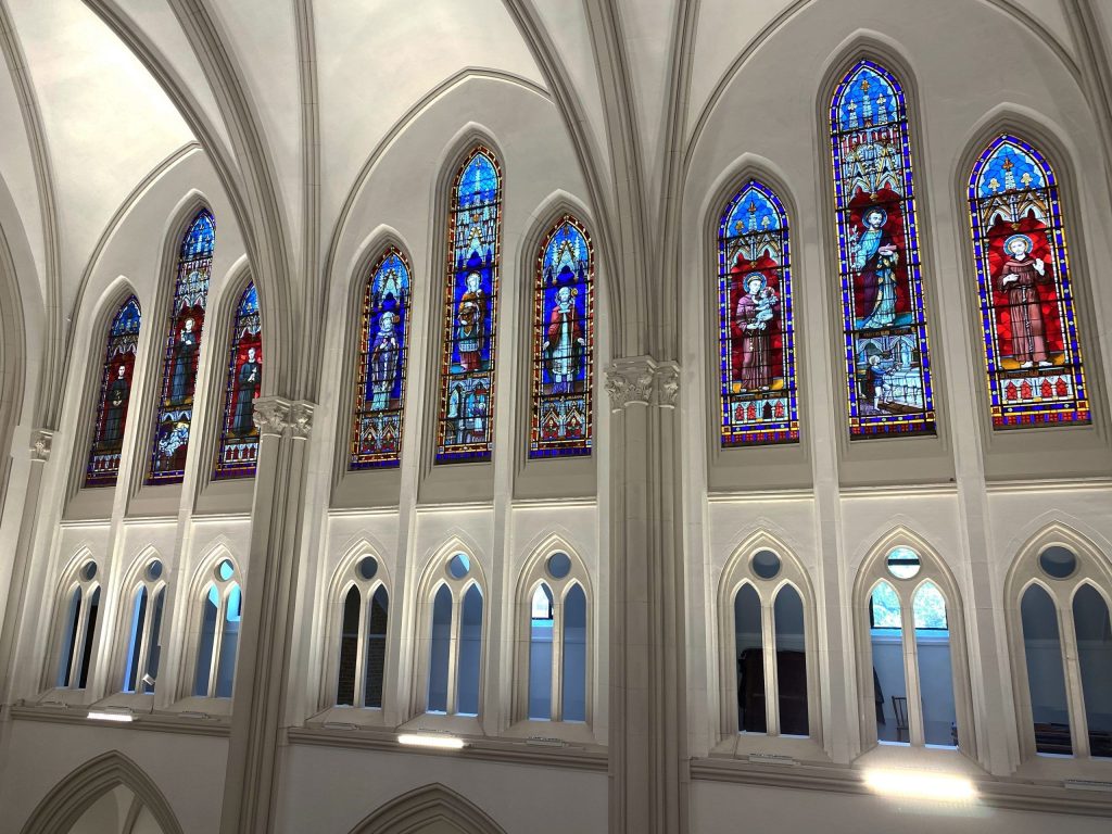 Las vidrieras son obra de la casa Maumejean y representan diferentes imágenes de Nuestro Señor, de la Virgen, de los santos redentoristas o de otros santos relacionados con la Congregación del Santísimo Redentor como patronos o modelos apostólicos.